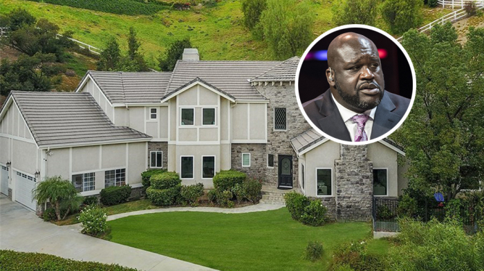According to the all but all-knowing real estate yenta Yolanda Yakketeyyak, 7’1” retired professional basketball icon Shaquille O’Neal sealed the deal on a $1.815 million purchase of a freshly renovated residence in the guard-gated Bell Canyon enclave near Calabasas in L.A.’s prosperous far western suburbs. Perched above the street on a one acre parcel, the 1990s ersatz-Tudor features a faux-timbered stucco exterior and a stone-faced turreted entry that gives way to a luxuriously appointed and crisply, if generically contemporary residence with five bedrooms and 4.5 bathrooms in 5,217-square-feet.